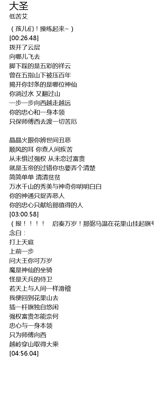 | [03:28.94] | (报!!!! 启奏万岁!那弼马温在花果山挂起旗号自称齐天大圣,他要与万岁平起平坐!) |