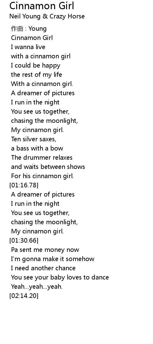 | [01:28.07] | My cinnamon girl. |
