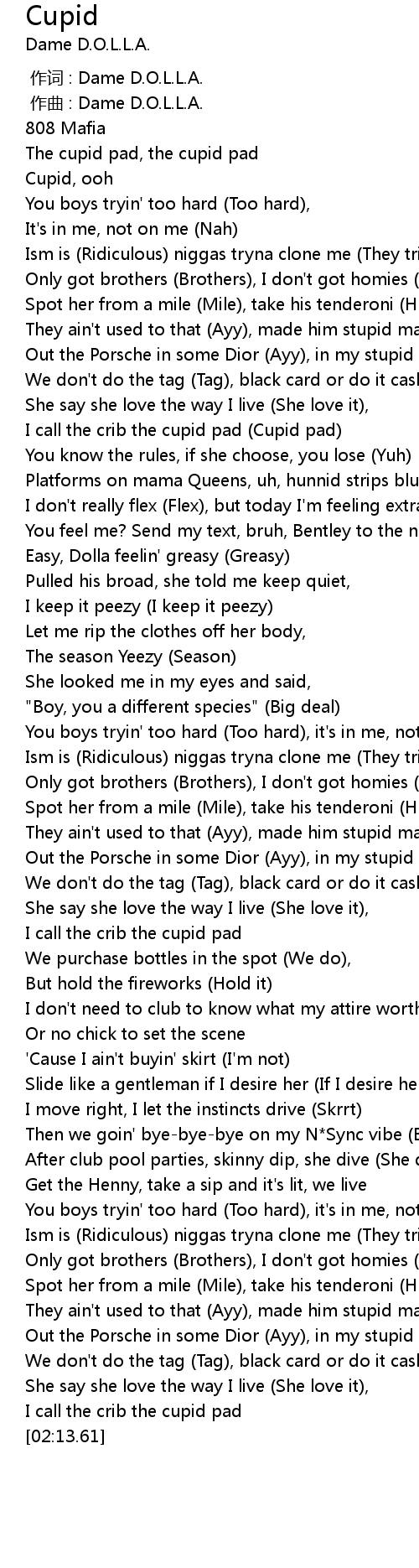 | [00:34.79] | I call the crib the cupid pad (Cupid pad) |