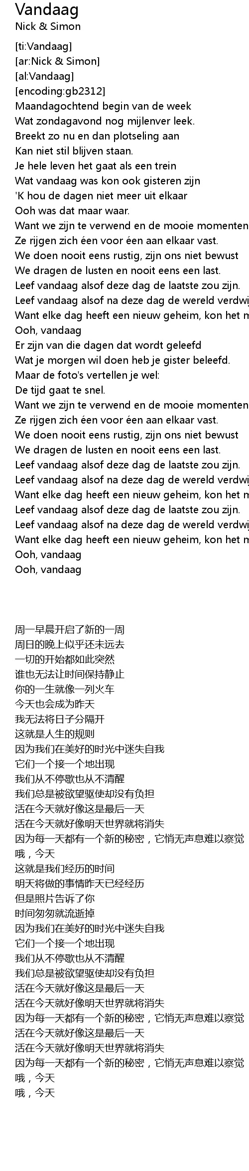 | 歌曲 | Vandaag |