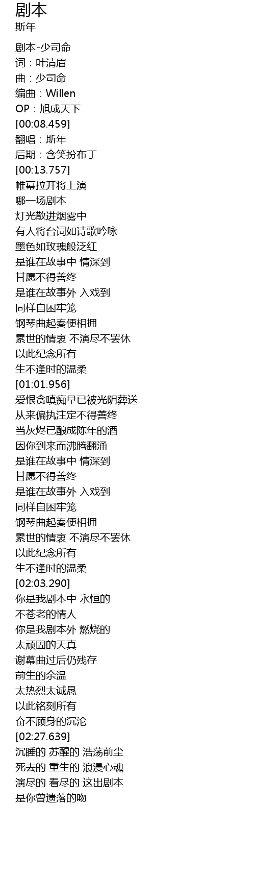| [02:52.145] | 演尽的 看尽的 这出剧本 |