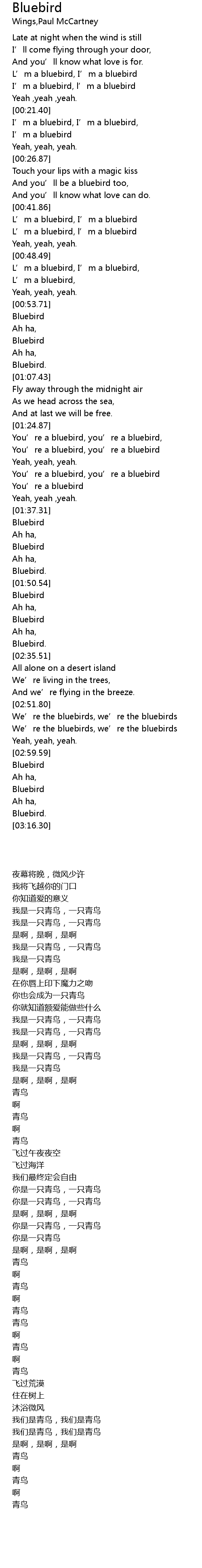 | [00:15.26] | L’m a bluebird, I’m a bluebird |