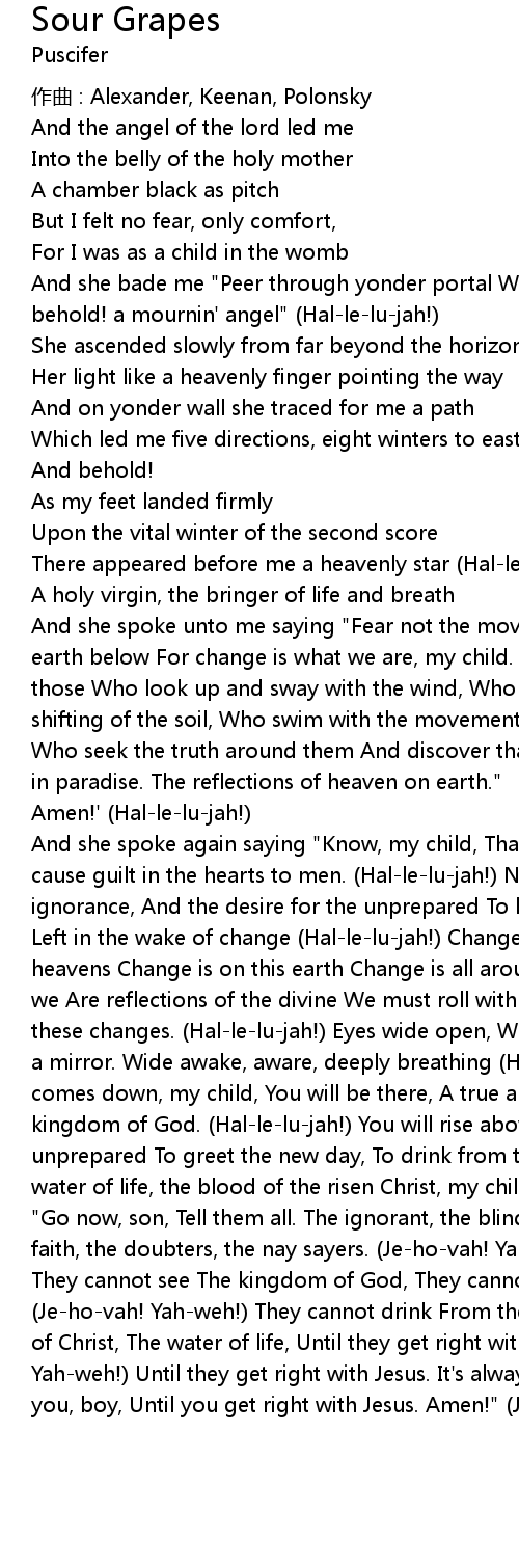 | And she spoke again saying " Know, my child, That there is no devil seekin' To cause guilt in the hearts to men. Hallelujah! No evil, save blind faith, ignorance, And the desire for the unprepared To blame others for the devastation Left in the wake of change Hallelujah! Change, my child Change is in the heavens Change is on this earth Change is all around us Hallelujah! And if we Are reflections of the divine We must roll with these changes, For we are these changes. Hallelujah! Eyes wide open, We must look upon The heavens as a mirror. Wide awake, aware, deeply breathing Hallelujah! And when the ship comes down, my child, You will be there, A true and holy survivor To inherit the kingdom of God. Hallelujah! You will rise above the grumbles of the unprepared To greet the new day, To drink from the sweet fruit of the vine, The water of life, the blood of the risen Christ, my child." Jehovah! Yahweh! " Go now, son, Tell them all. The ignorant, the blind paw of dogma, Blinded by faith, the doubters, the nay sayers. Jehovah! Yahweh! Tell them all, child, They cannot see The kingdom of God, They cannot see paradise Unfold before them Jehovah! Yahweh! They cannot drink From the chalice Which holds the blood of Christ, The water of life, Until they get right with Jesus. Jehovah! Yahweh! Until they get right with Jesus. It' s always gonna be Sour grapes with you, boy, Until you get right with Jesus. Amen!" Jehovah! Yahweh! |