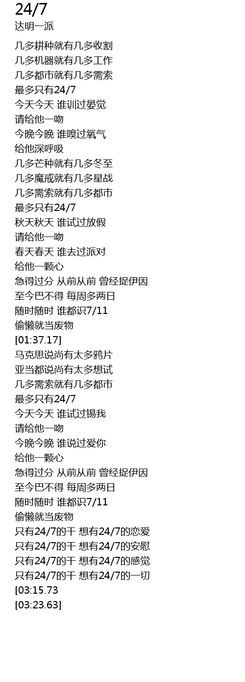 | [03:19.63][03:15.73][03:11.55] | 只有24/7的干 |