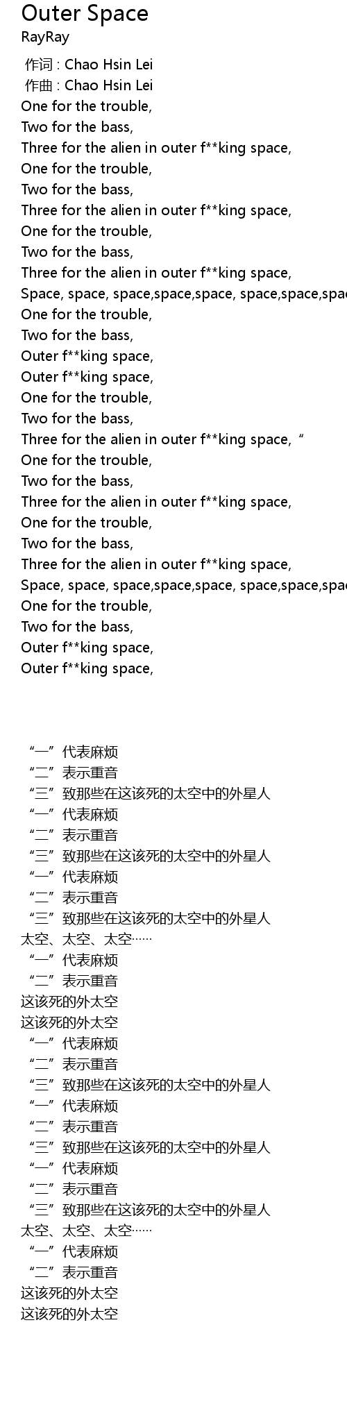 | [00:34.53] | Three for the alien in outer f**king space, |