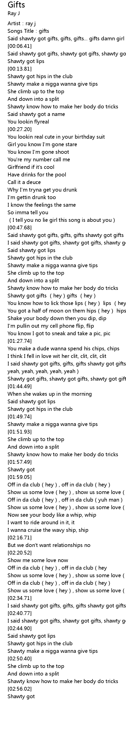 | [01:34.49] | I said shawty got gifts, gifts, gifts shawty got gifts yeah... yeah, yeah, yeah, yeah, yeah |