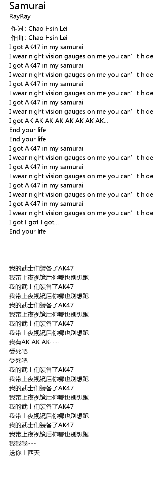 | [01:28.699] | I got AK47 in my samurai |