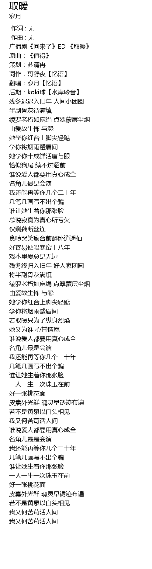 | [00:03.59] | 广播剧《回来了》ED 《取暖》 |