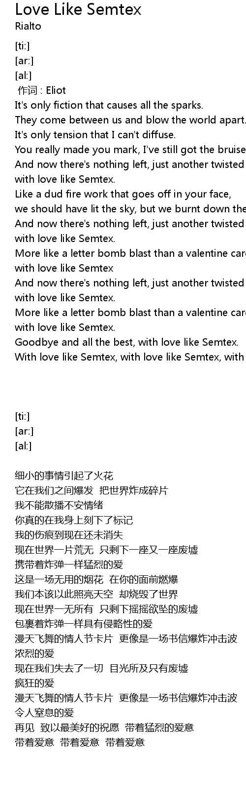 | [02:53.89] | With love like Semtex, with love like Semtex, with love like Semtex. |