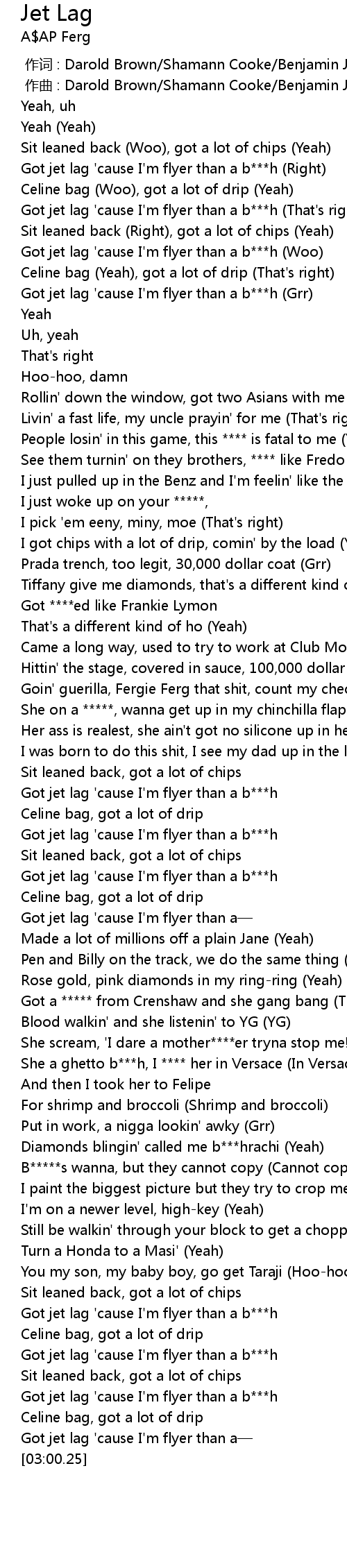 | [00:25.08] | Got jet lag 'cause I'm flyer than a b***h (Woo) |