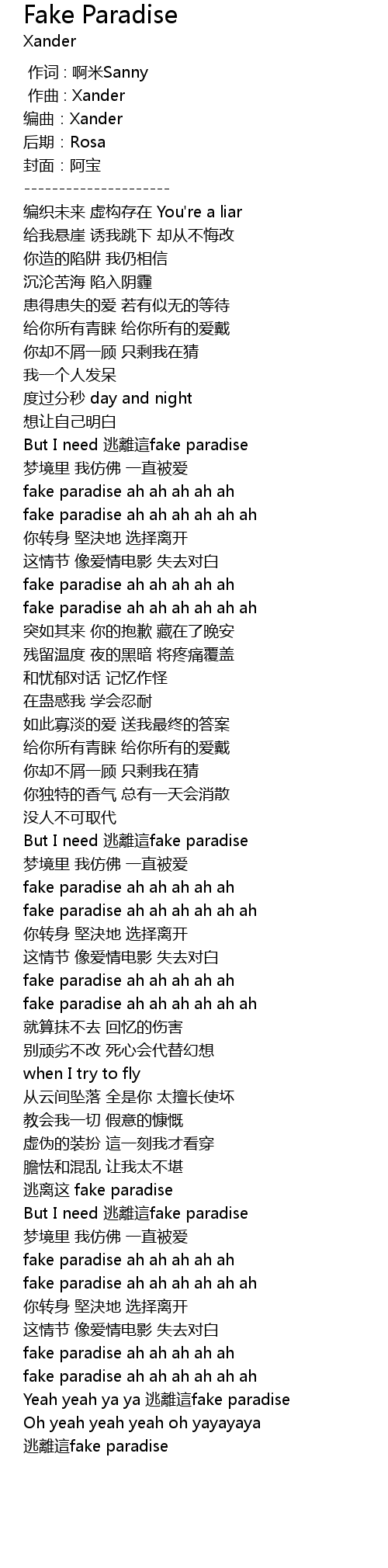 | [00:44.174] | But I need táo lí zhè fake paradise |