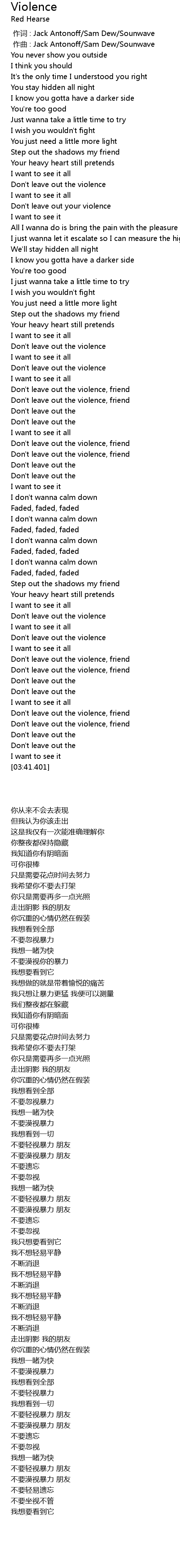 | [03:34.086] | Don't leave out the violence, friend |