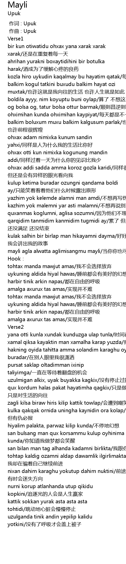 | [01:33.284] | hakning oyida tahitta amma solandim karaghu oyga buradar zài bié rén yǎn lǐ wǒ hěn xiāo sǎ |