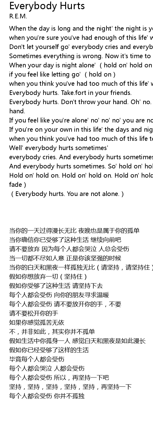 | [02:16.199] | Everybody hurts. Don' t throw your hand. Oh' no. Don' t throw your hand. |