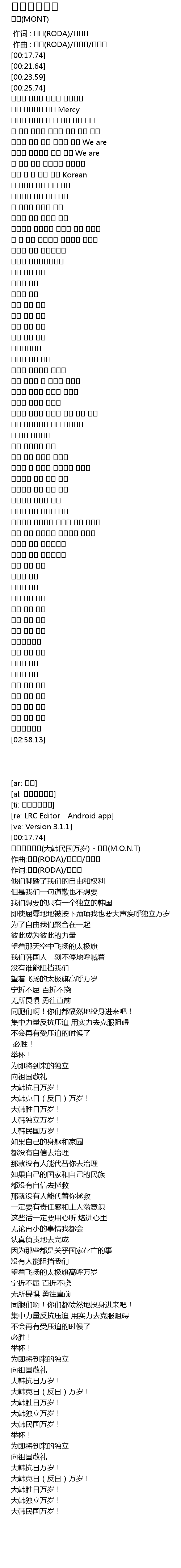 | [00:21.64] | 대한민국만세(大韩民国万岁) - 몬트(M.O.N.T) |