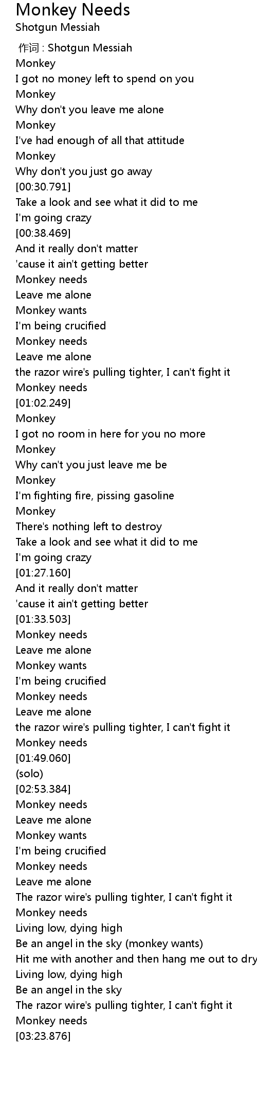| [03:12.109] | Hit me with another and then hang me out to dry (monkey needs) |