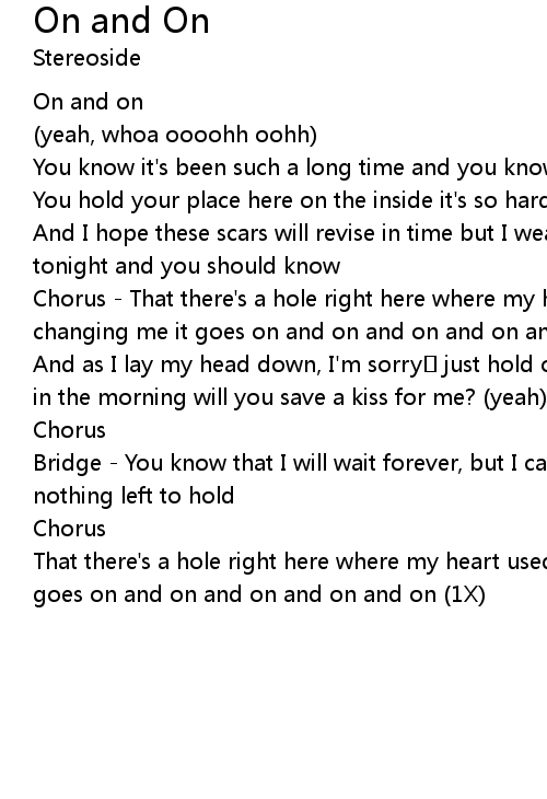 | Chorus That there' s a hole right here where my heart used to be, forever changing me it goes on and on and on and on and on oohh yeah 2X yeah | |