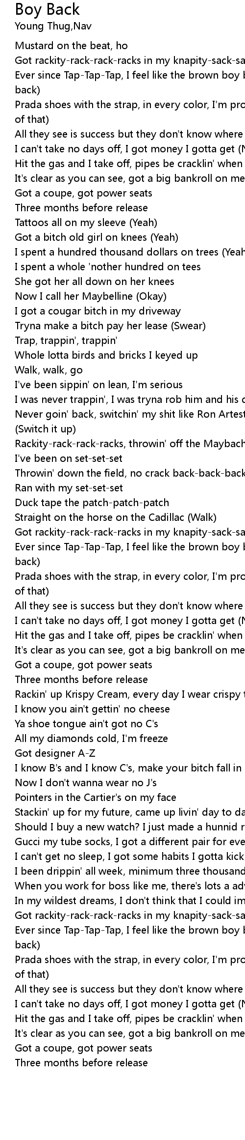 [02:30.750] Ever since Tap-Tap-Tap, I feel like the brown boy back-back-back (I'm back)
