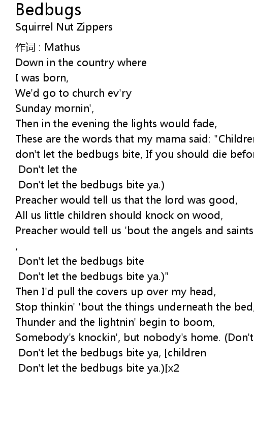 | Somebody' s knockin', but nobody' s home. Don' t let the bedbugs bite ya, children Don' t let the bedbugs bite ya, children Don' t let the bedbugs bite ya, no, no Don' t let the bedbugs bite ya. x2 |
