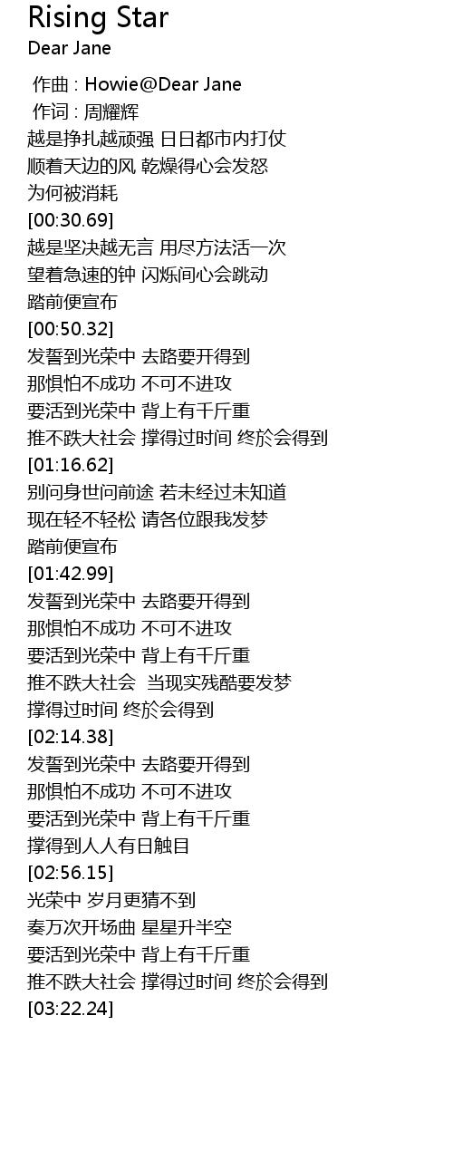 | [03:04.97] | 要活到光荣中 背上有千斤重 |