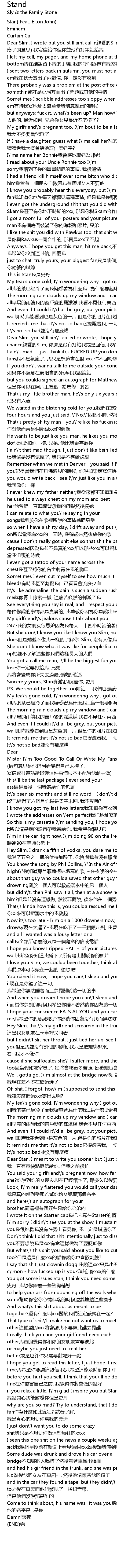 | Dear Slim, I wrote but you still aint callin親愛的Slim(阿姆暱稱, 瘦子的意思) 我寫信給你但你並沒有打電話給我 | |