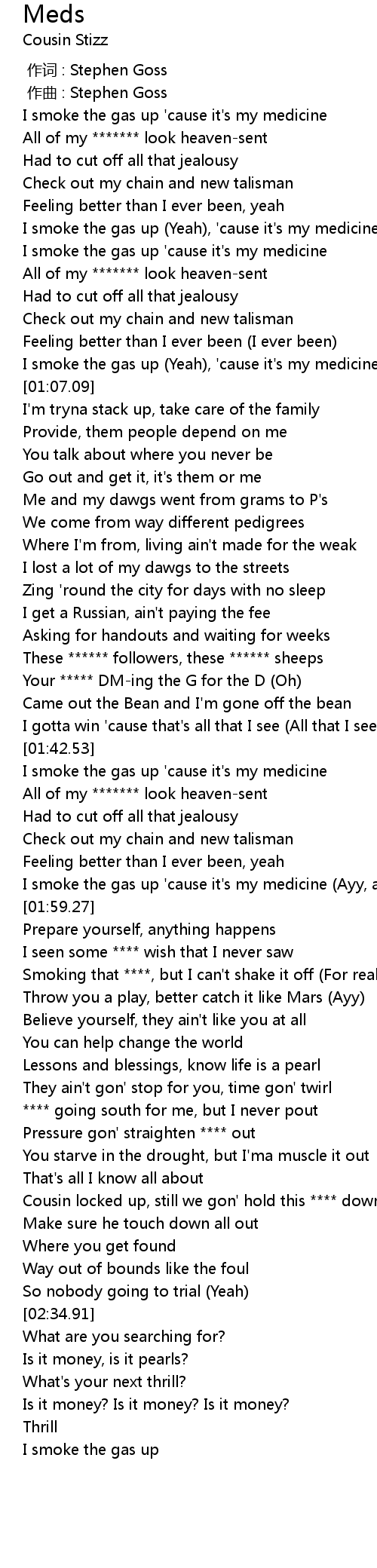 | [00:47.27] | I smoke the gas up Yeah, ' cause it' s my medicine Ayy |