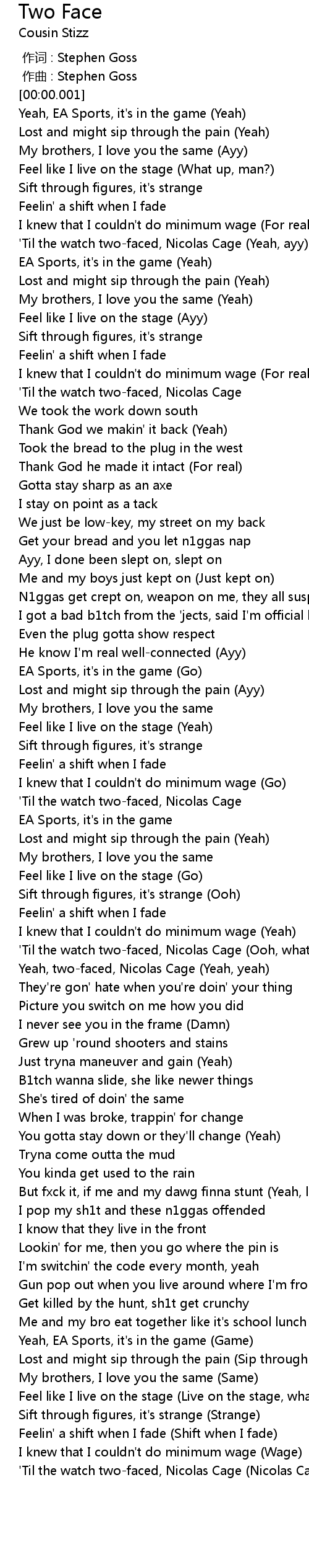 | [01:35.940] | Yeah, twofaced, Nicolas Cage Yeah, yeah |