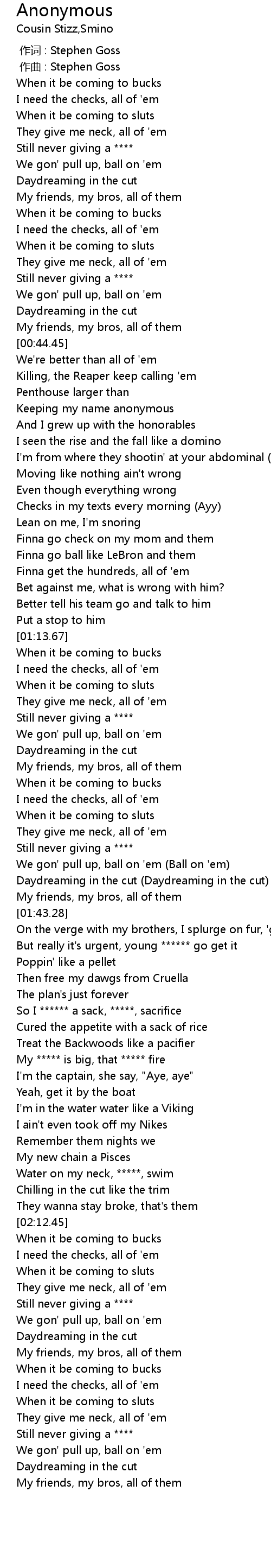 | [01:55.56] | My ***** is big, that ***** fire |