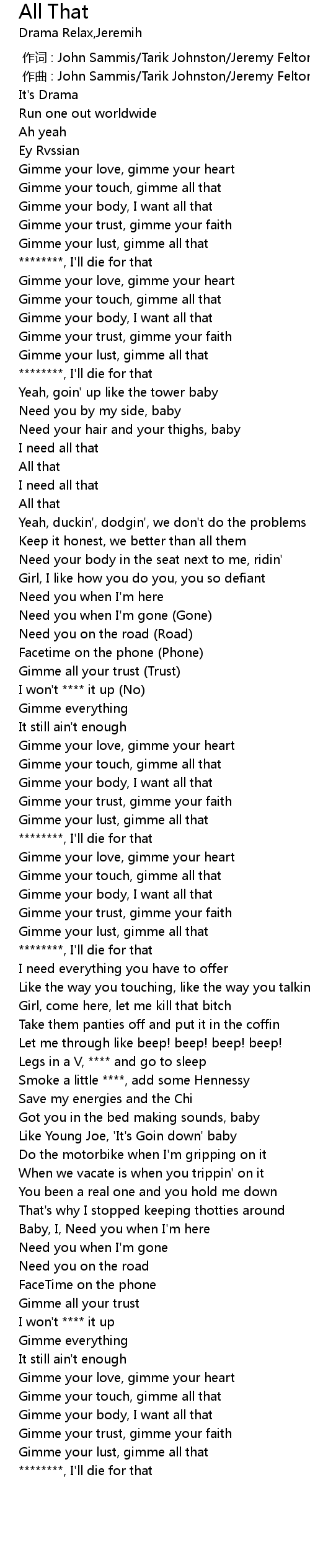 | [02:01.16] | Smoke a little ****, add some Hennessy |
