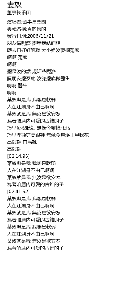 | [02:17.14] | 某奴嘸是我 我嘸是軟弱 |