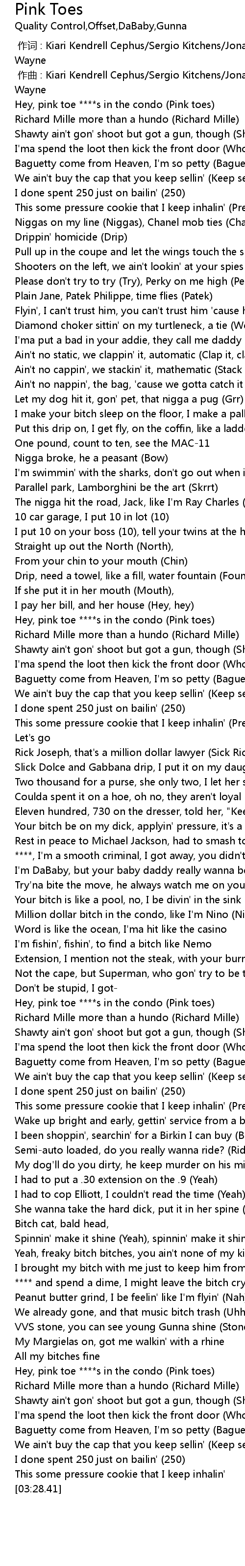 | [02:18.85] | Hey, pink toe ****s in the condo (Pink toes) |