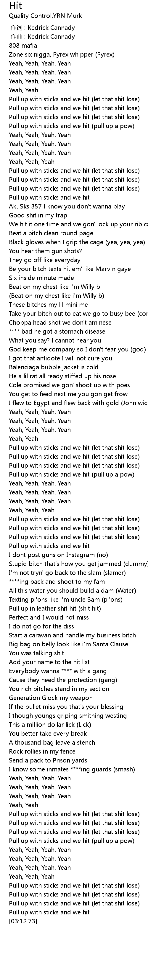 | [03:06.39] | Pull up with sticks and we hit (let that shit lose) |