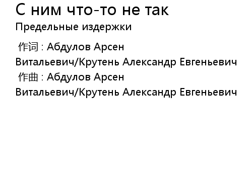 | [00:00.00-1] | 作曲 : Абдулов Арсен Витальевич/Крутень Александр Евгеньевич |