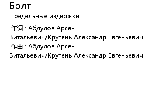 | [00:00.00-1] | 作曲 : Абдулов Арсен Витальевич/Крутень Александр Евгеньевич |