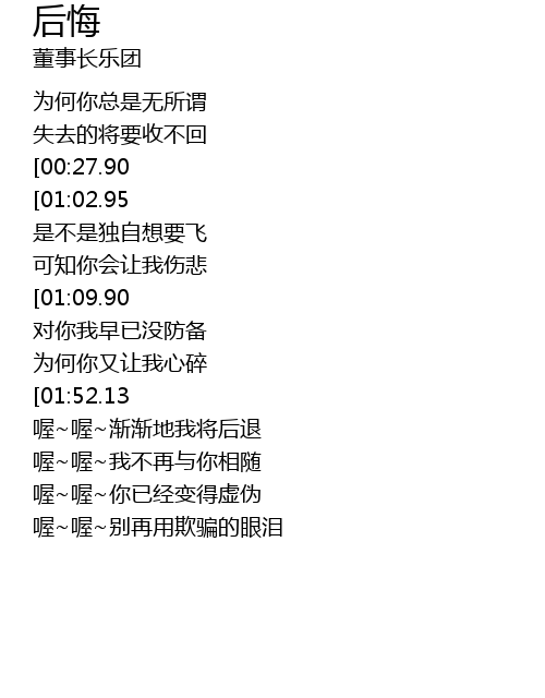 | [01:45.12][01:02.95][00:55.96][00:34.89] | 你会 后悔 后悔 |