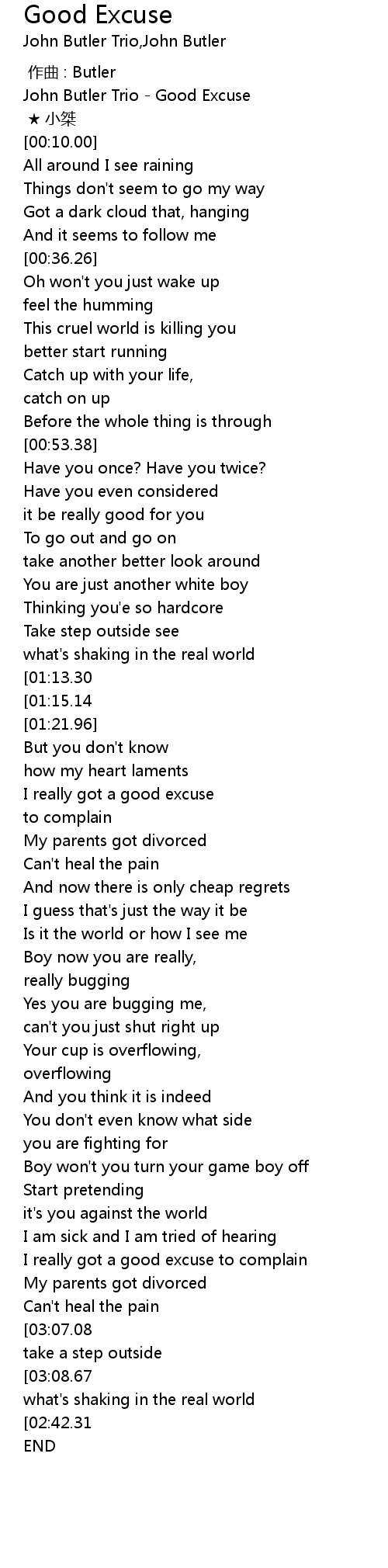 | [00:00.00] | John Butler Trio - Good Excuse |