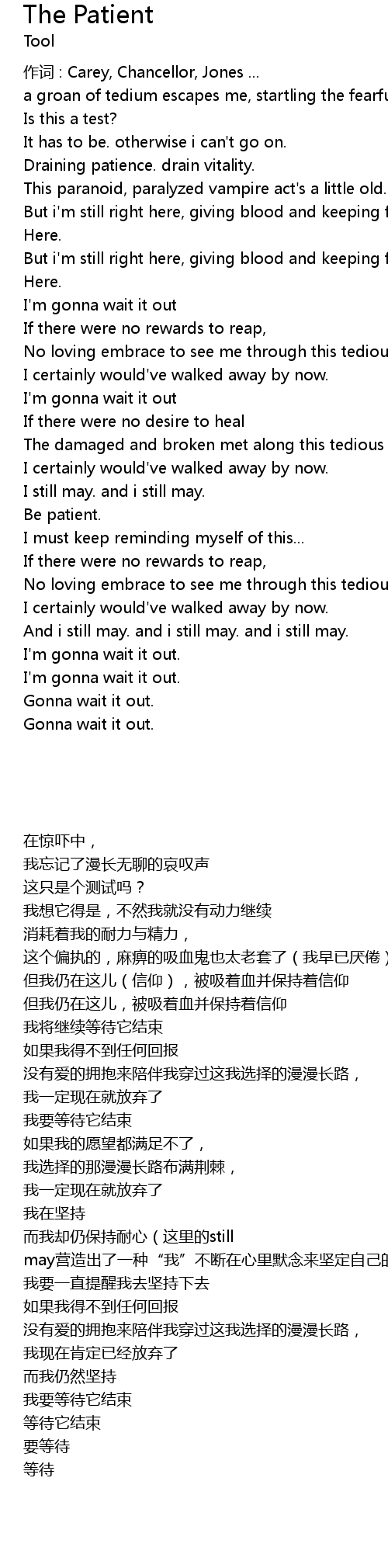 | [05:53] | 而我却仍保持耐心(这里的still may营造出了一种“我”不断在心里默念来坚定自己的感觉) |