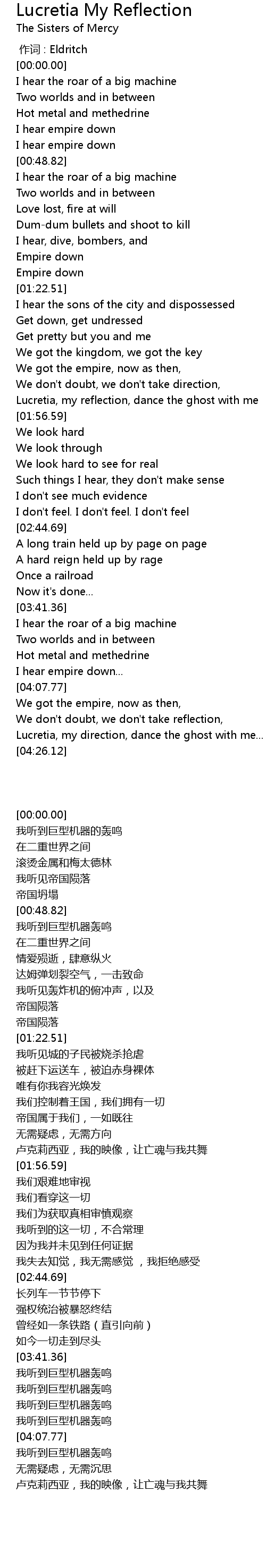 | [04:18.64] | 卢克莉西亚,我的映像,让亡魂与我共舞 |
