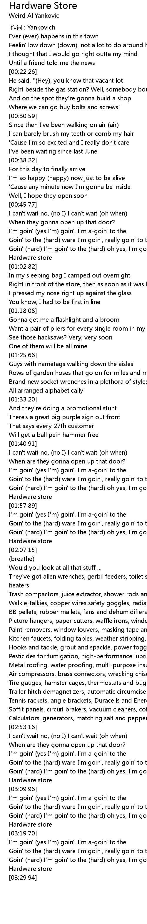 | [00:28.38] | Where we can go buy bolts and screws" |