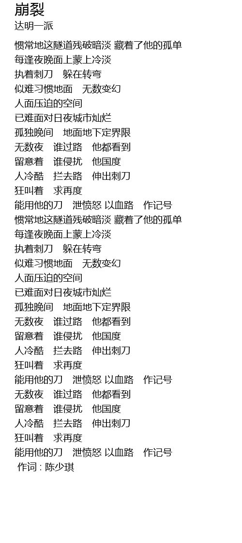 | [02:27] | 惯常地这隧道残破暗淡 藏着了他的孤单 |