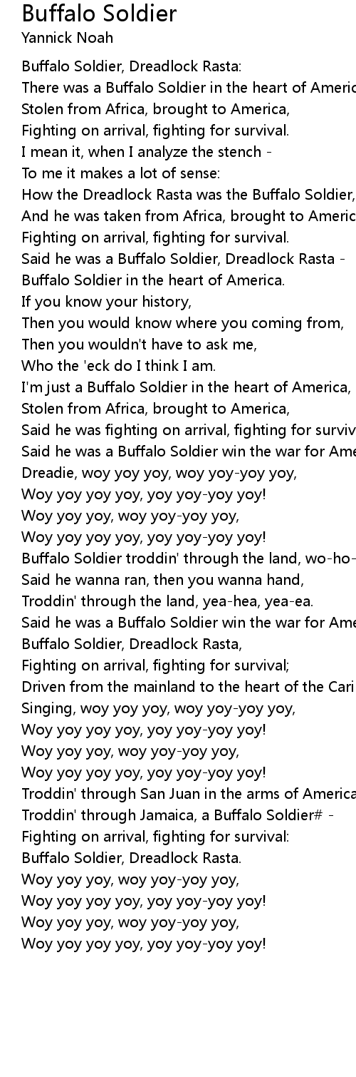 Buffalo Soldier troddin' through the land, wo-ho-ooh! |