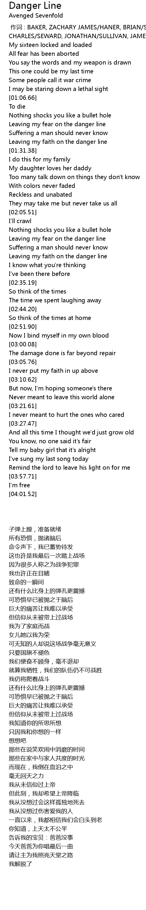 | [01:25.64] | Leaving my faith on the danger line |