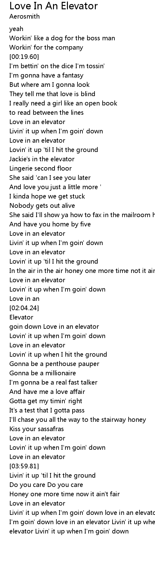 Livin' it up when I'm goin' down love in an elevator Livin' it up when I'm goin' down love in an elevator Livin' it up when I'm goin' down love in an elevator Livin' it up when I'm goin' down |