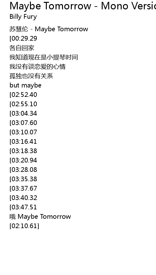 | [00:00.00] | 苏慧伦 - Maybe Tomorrow |