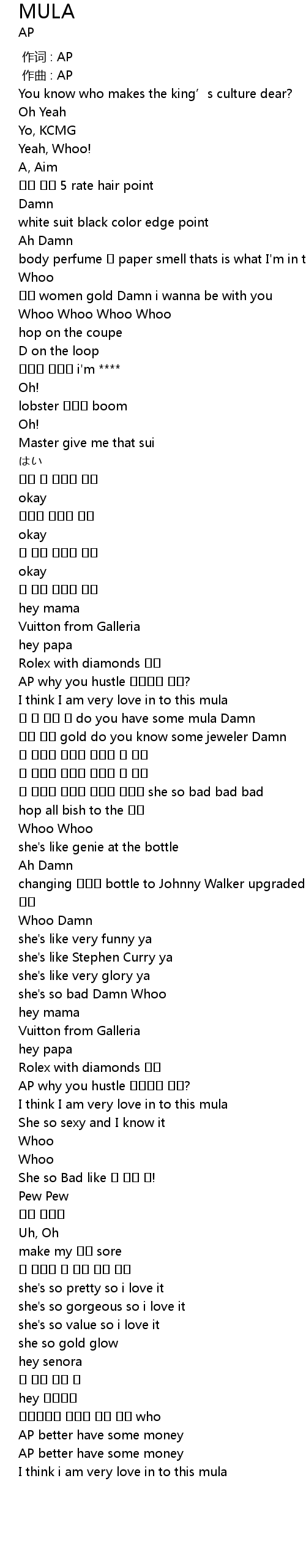 | [01:46.730] | AP why you hustle 발바닥에 불나? |