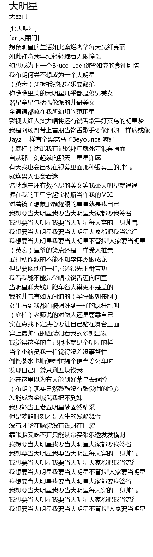 | [01:31.527] | wǒ xiǎng yào dāng dà míng xīng wǒ yào dāng dà míng xīng bù guǎn lā! rén jiā yào dāng míng xīng |