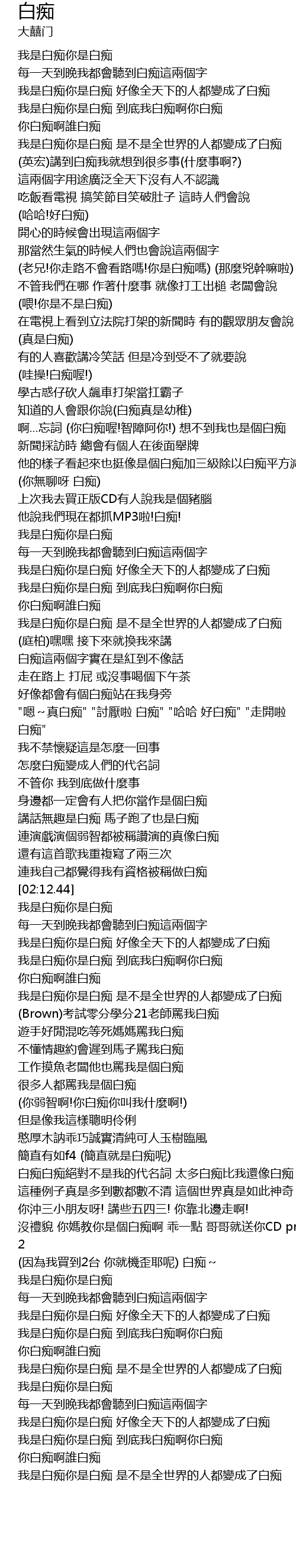 | [03:54.29] | 我是白痴你是白痴 每一天到晚我都會聽到白痴這兩個字 |