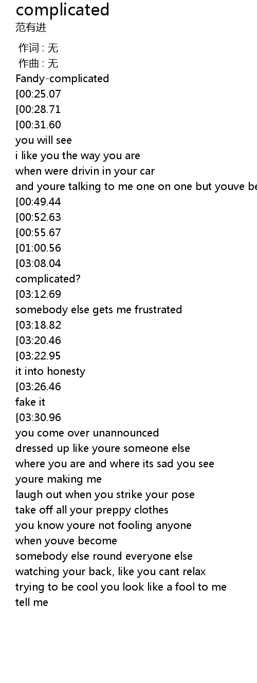 | [03:32.81][03:08.04][02:06.68][01:01.78] | why you have to go and make things so complicated? |