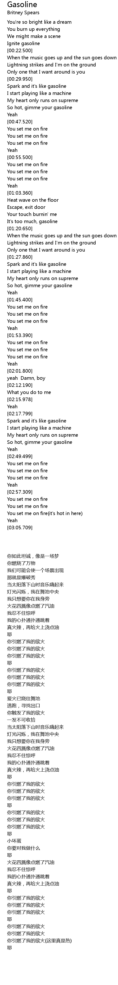 | [00:32.200] | Spark and it' s like gasoline |