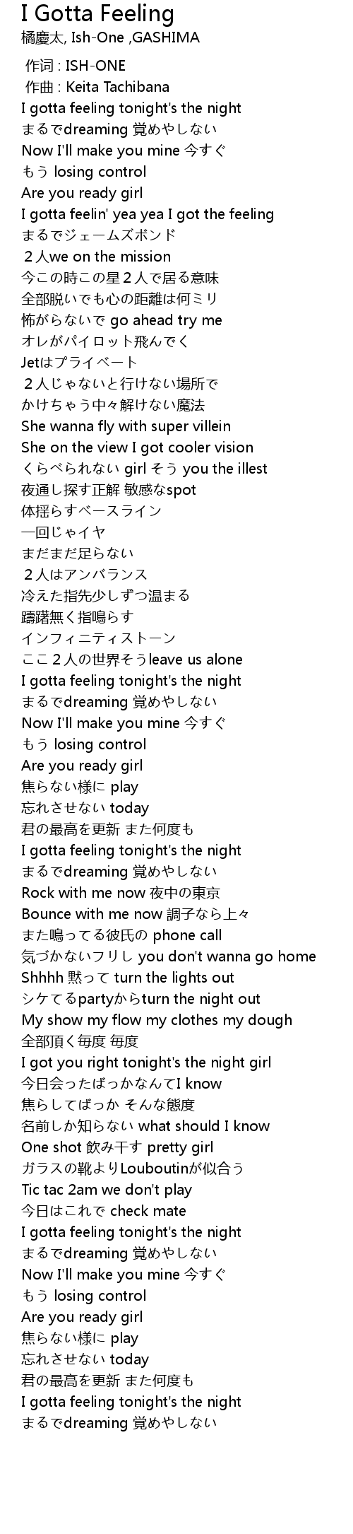 | [01:31.41] | I gotta feeling tonight's the night |
